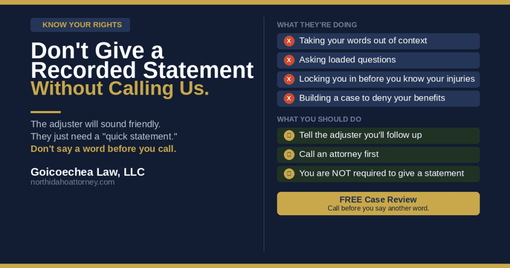 After a work injury in Idaho, an insurance adjuster will call. They’ll sound friendly and professional. They’ll say they just need a quick statement to “process your claim.”